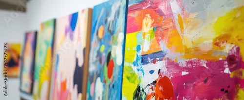 Colorful abstract paintings on display.