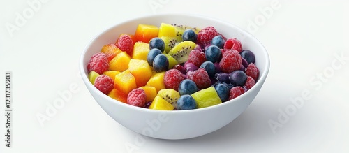 Colorful acai bowl with vibrant fruits including raspberries, blueberries, and kiwi in a white bowl against a soft neutral background.