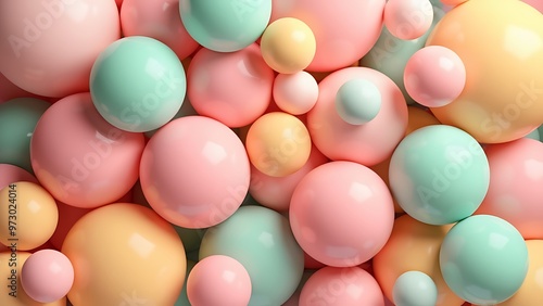 Colorful array of 3D spheres in various sizes and pastel hues, creating a playful and dynamic composition. Ideal for use in creative projects, backgrounds, or digital art.