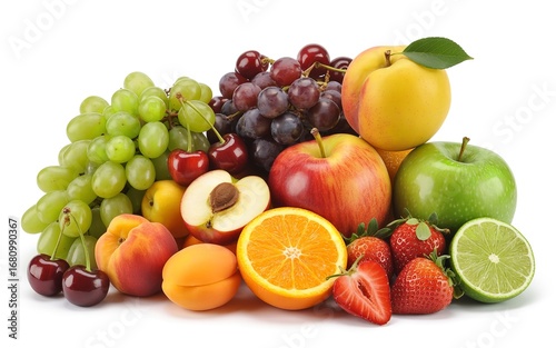 Colorful assortment of fresh fruits including grapes, apples, peaches, cherries, citrus and berries in vibrant natural display
