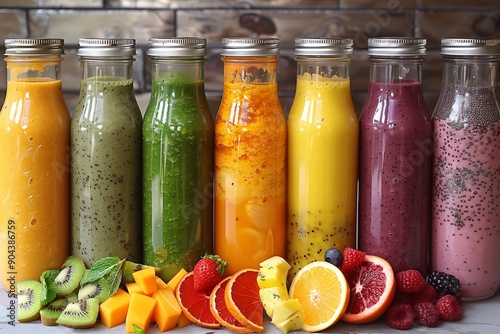 Colorful Assortment Of Fresh Juices In Glass Bottles Displayed On A Counter