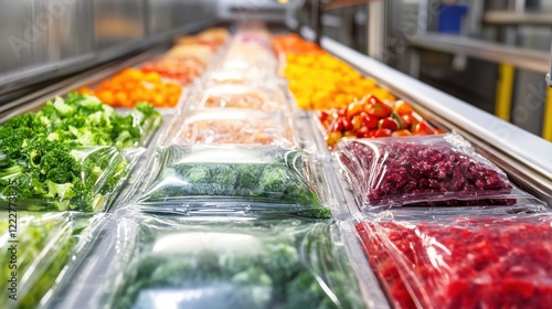 Colorful assortment of fresh vegetables and fruits in packaging at a grocery store display