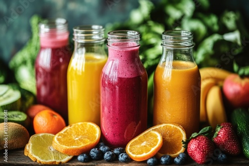 Colorful assortment of smoothies made with fresh fruit, served in reusable glass bottles. Perfect for a healthy lifestyle.