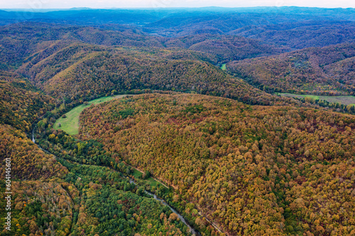 Colorful autumn mountain hills and big curve of river Veleka in Strandja mountain Bulgaria