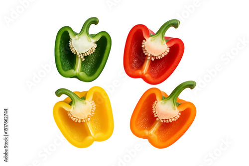 Colorful bell pepper halves isolated fresh green, red, yellow, and orange capsicum slices with seeds. Ideal for food packaging, healthy diet concepts, clipping path, transparent, cut in half,