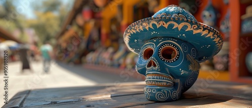 Colorful blue ceramic skull wearing a hat, displayed in an outdoor market with vibrant stalls and a blurred background.
