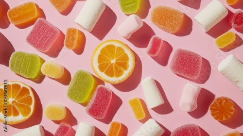 Colorful Candy and Marshmallow Scatter on Pink Surface