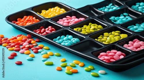 Colorful candy sprinkles in a tray.