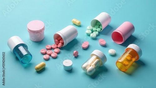 Colorful Capsules and Tablets Spilled from Various Containers on a Light Blue Surface
