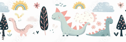 Colorful cartoon dinosaurs in a whimsical landscape. This vibrant image showcases playful cartoon dinosaurs in a variety of colors, surrounded by whimsical flora and other cute elements
