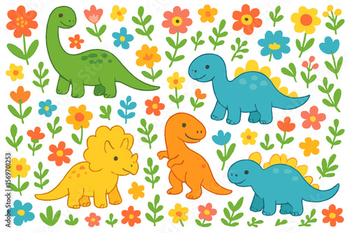 Colorful cartoon dinosaurs surrounded by flowers in a playful design for children