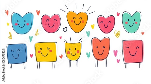 Colorful cartoon hearts and shapes with smiling faces on white background.