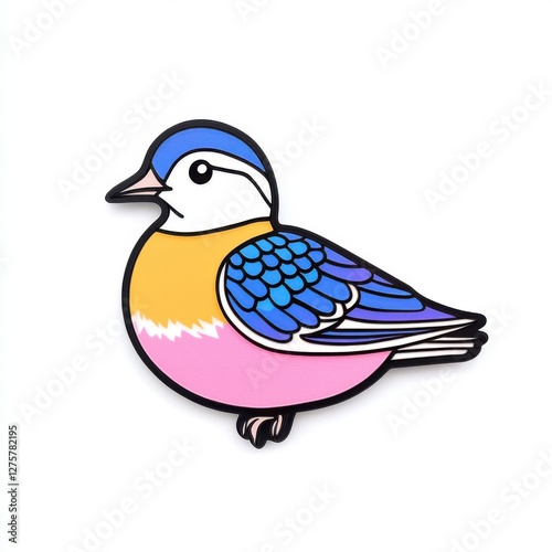 Colorful cartoon style bird illustration with vibrant blue, yellow, and pink feathers on a white background