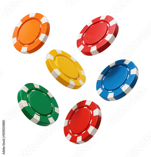Colorful Casino Chips Featuring Various Shades of Orange, Yellow, Green, Red, Blue, and White, Isolated on Transparent and White Background