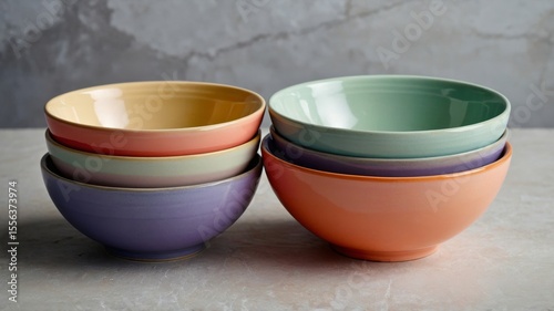 Colorful Ceramic Bowls Stacked Together on a Light Concrete Surface, Highlighting Their Unique Shapes and Decorative Finishes, Ideal for Serving Food or as Display Pieces