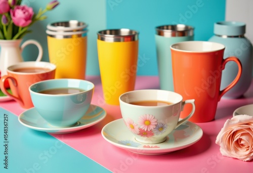 Colorful ceramic cups and mugs with tea or coffee on a vibrant pink and blue background