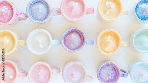 Colorful Ceramic Mugs Arranged in Rows on a Bright Surface