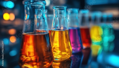 Colorful chemicals in glass flasks shown under bright lab lights in an educational space