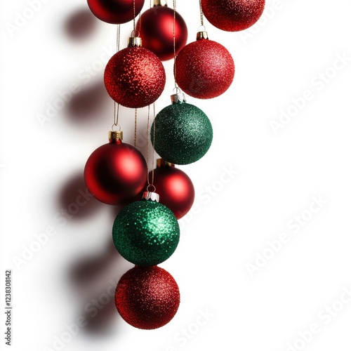 Colorful Christmas ornaments in red and green, hanging delicately, adding festive charm to holiday decor.