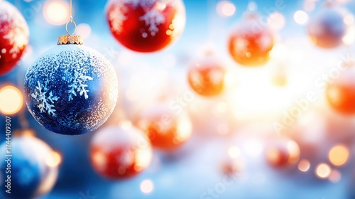Colorful Christmas ornaments shine in a winter wonderland setting