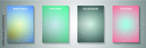 Colorful circle faded screen tone cover page templates vector series. Digital catalog perforated screen tone patterns. Retro cartoon comics style front page layouts. Overlay spots grid