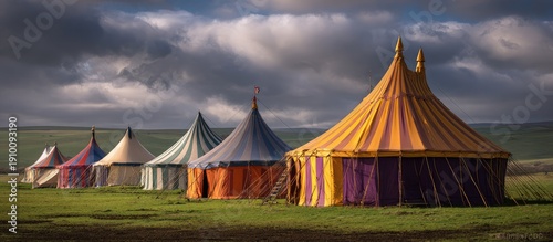 Colorful Circus Tents Set Up on Green Field Under Dramatic Cloudy Sky
