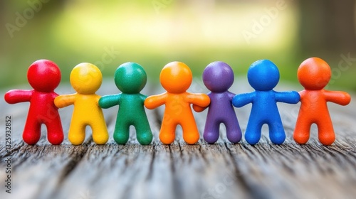 Colorful clay figures in a row on wooden surface