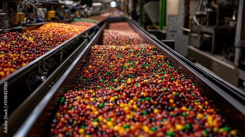 Colorful coated candies moving on a factory conveyor belt.