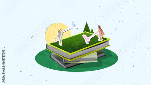 Colorful collage of two children playing lacrosse on book-shaped grass field under sun. Concept of youth sports, active lifestyle, outdoor competition, teamwork, and skill development.