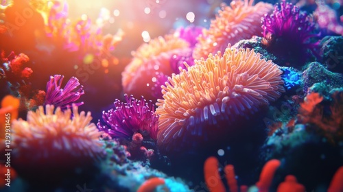 Colorful coral reef with vibrant sea anemones in sunlight, underwater scene. Marine life and biodiversity concept