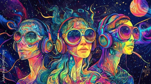 Colorful cosmic portrait of three women wearing headphones and enjoying music