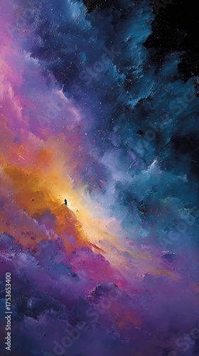 Colorful cosmic scene depicting vibrant nebulae and stars with a silhouette of a person contemplating the universe