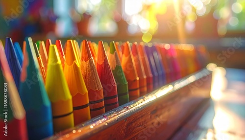 Colorful Crayons Arrangement with Soft Sunset Light in Background