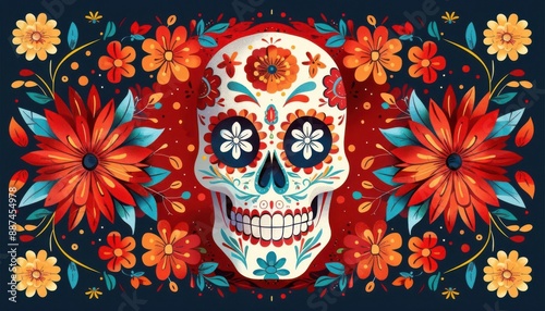 Colorful Day of the Dead sugar skull illustration with vibrant floral background, celebrating Mexican culture and tradition.