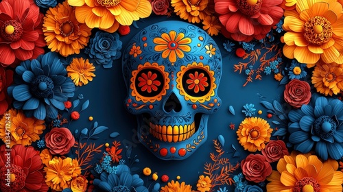 Colorful Decorative Skull Surrounded by Vibrant Floral Elements and Intricate Designs