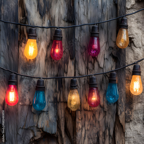 Colorful Decorative String Lights Hanging Against Textured Wooden Background