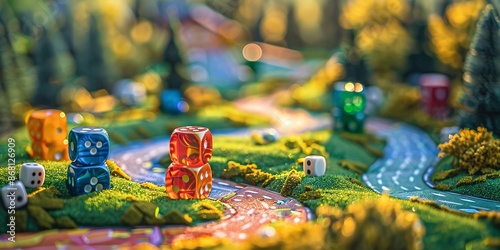 Colorful Dice on Scenic Miniature Board Game Pathway