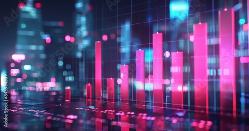 Colorful digital bar chart representing data analytics, financial information, and real-time statistics in a futuristic cityscape background.