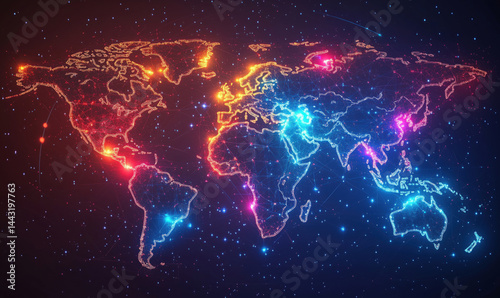 Colorful digital world map with glowing connections and starry background.