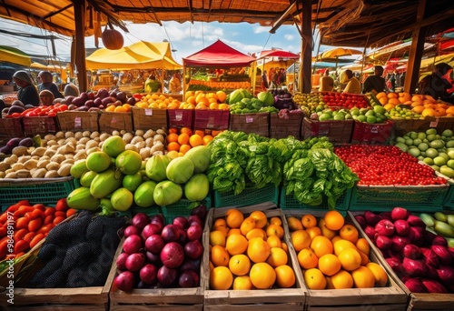 colorful display fresh fruits vegetables showcasing vibrant variety bounty lush market setting, apples, oranges, bananas, grapes, berries, carrots