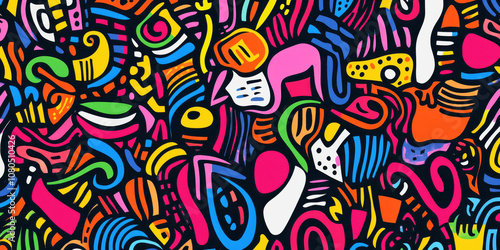 Colorful doodle seamless pattern featuring bold geometric and freeform shapes in neon shades
