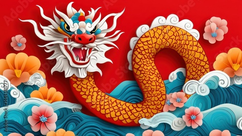 Colorful Dragon Illustration Amid Waves and Flowers in Bright Design