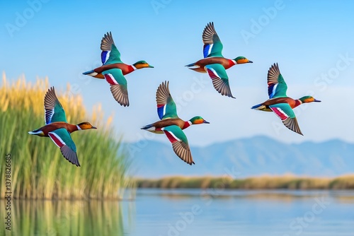 Colorful Ducks Flying Over Calm Lake with Clear Blue Sky, Nature and Wildlife Concept