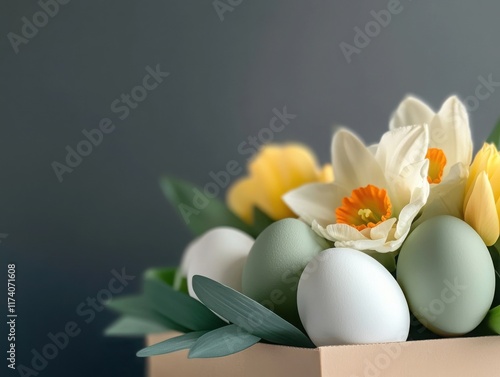 Colorful easter eggs and fresh flowers arranged in a decorative box for spring celebrations indoors