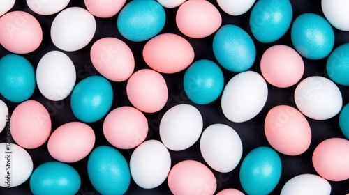 Colorful Easter Eggs Background Pattern in Pink Blue and White on Dark Surface Top View.