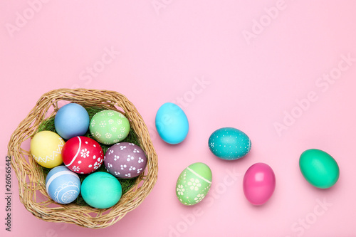 Colorful easter eggs in basket on pink background