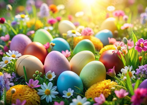 Colorful Easter Eggs Nestled in Spring Flowers - Festive Spring Holiday Decoration