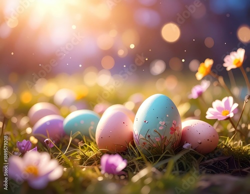 Colorful Easter Eggs Nestled in Spring Flowers and Soft Light