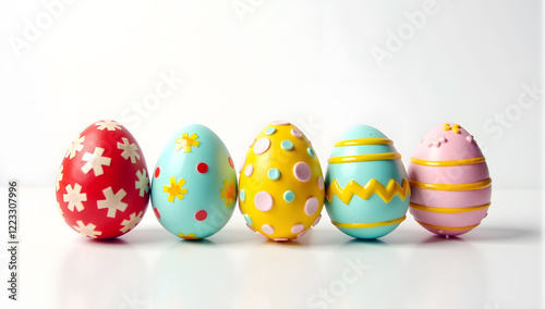 Colorful Easter Eggs with Decorative Patterns Arranged in a Line on a White Background, Offering Ample Copy Space for Text or Seasonal Holiday Designs