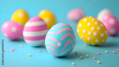 Colorful Easter Eggs with Polka Dots, Stripes, and Swirls on a Light Blue Background